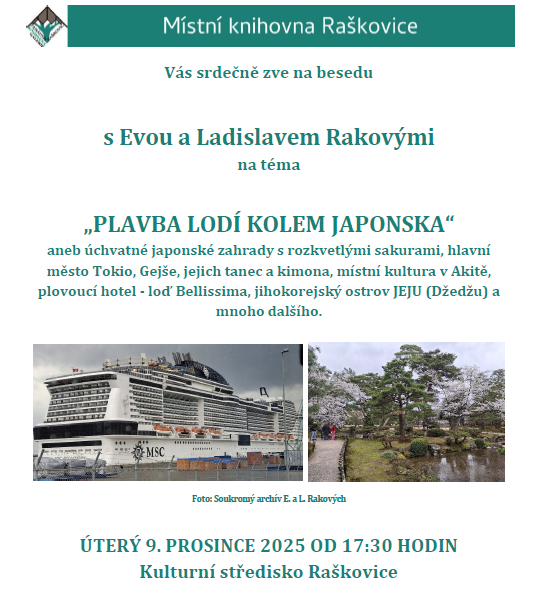 Úvod > Pro občany > Aktuality > Beseda s Evou a Ladislavem Rakovými na téma „PLAVBA LODÍ KOLEM JAPONSKA“