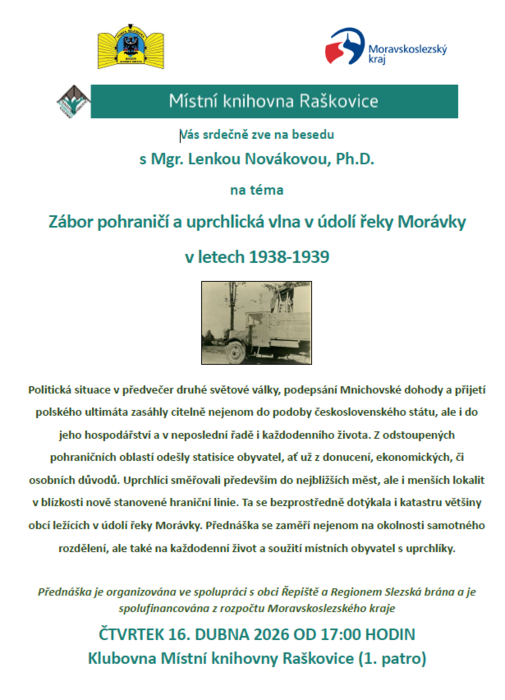 Politická situace v předvečer druhé světové války, podepsání Mnichovské dohody a přijetí polského ultimáta zasáhly citelně nejenom do podoby československého státu, ale i do jeho hospodářství a v neposlední řadě i každodenního života. Z odstoupených pohraničních oblastí odešly statisíce obyvatel, ať už z donucení, ekonomických, či osobních důvodů. Uprchlíci směřovali především do nejbližších měst, ale i menších lokalit v blízkosti nově stanovené hraniční linie. Ta se bezprostředně dotýkala i katastru většiny obcí ležících v údolí řeky Morávky. Přednáška se zaměří nejenom na okolnosti samotného rozdělení, ale také na každodenní život a soužití místních obyvatel s uprchlíky.