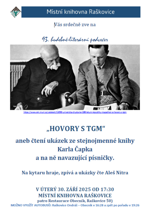 „HOVORY S TGM“ aneb čtení ukázek ze stejnojmenné knihy Karla Čapka a na ně navazující písničky.