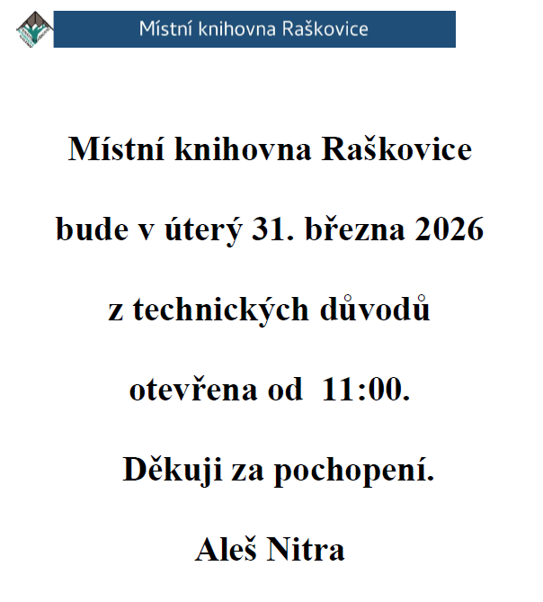 Místní knihovna Raškovice bude v úterý 31.3.2026 otevřena až od 11:00.
