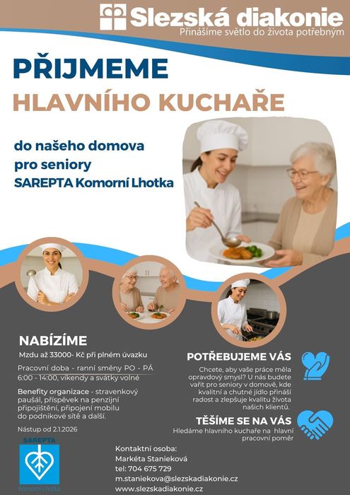 Úvod > Pro občany > Aktuality > Nabídka zaměstnání - Hlavní kuchař v domově pro seniory SAREPTA Komorní Lhotka