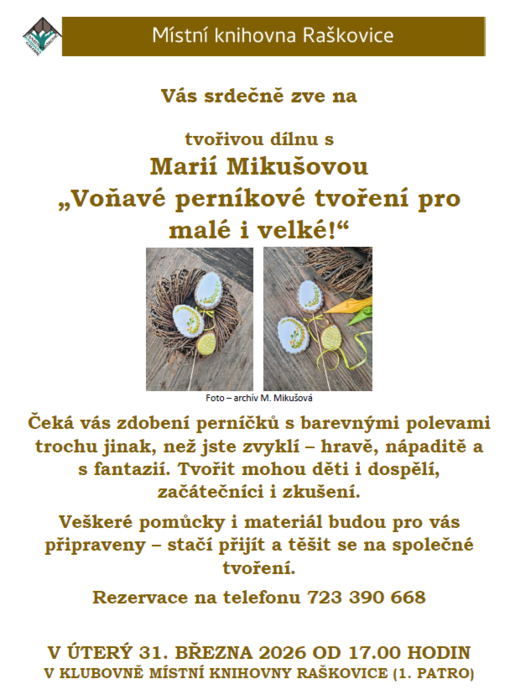 V ÚTERÝ 31. BŘEZNA 2026 OD 17.00 HODIN V KLUBOVNĚ MÍSTNÍ KNIHOVNY RAŠKOVICE (1. PATRO)