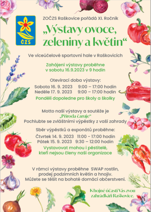 ZO ČZS Raškovice Vás zve na XI. ročník Výstavy ovoce, zeleniny a květin ve víceúčelové sportovní hale v Raškovicích. Zahájení výstavy v sobotu 16.09.2023 v 9:00 hod. Otvírací doba výstavy sobota 16.09.2023 od 9:00 do 17:00 hod. v neděli 17.09.2023 od 9:00 do 17:00 hod. Pondělí dopoledne pro školy a školky. Motto výstavy a soutěže je "Příroda čaruje".
