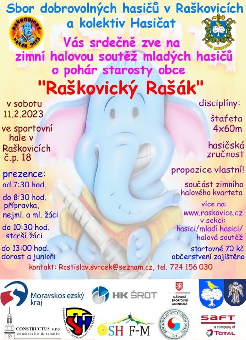 Dovolte, abych Vás jménem svým, sboru dobrovolných hasičů a raškovických Hasičat pozval na tradiční, již 7. ročník zimní halové soutěže o pohár starosty obce "Raškovický Rašák", který se koná v sobotu 11. února 2023 ve sportovní hale v Raškovicích. Prezence od 7:30 hod. Více v propozicích...