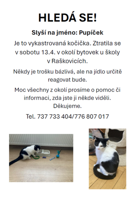 V sobotu 13.4. se v okolí bytovek u školy v Raškovicích ztratila kočka, slyší na jméno Pupíček.