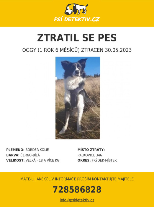 Úvod > Pro občany > Nalezení (ztracení) mazlíčci > Ztracený pes border kolie Ogi v obci Palkovice