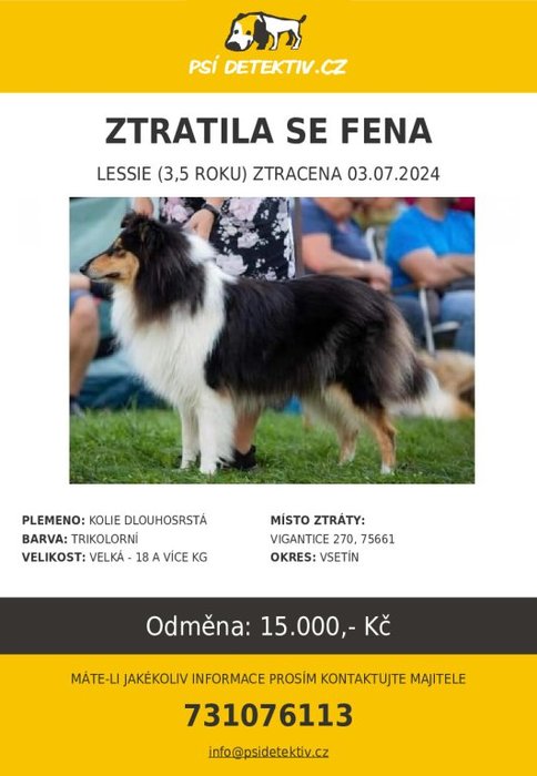 Ztratila se tříbarevná dlouhosrstá kolie jménem Lessie. Ztracena 3.7.2024.