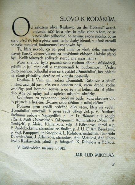 Ačkoliv Jaroslav Ludvík Mikoláš žil po mnoho let v sousední Skalici, věnoval rodné obci velkou pozornost. Dokumentoval lidovou kulturu, zapisoval koledy, písně, zvyky, publikoval podrobnosti o feudální hospodářství a postavení poddaných frýdeckého panství. Proto se jeho práce historická a národopisná stala inspirací pro vybudování Památníku obce.
